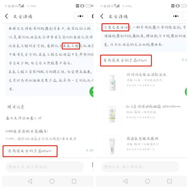 青眼通过某成分查询小程序分别搜索苯氧乙醇、乙基己基甘油发现,这两个成分的确在美妆产品里应用普遍。其中,显示含苯氧乙醇成分的产品达65万+,覆盖品牌有悦木之源、珂润、欧莱雅、雅诗兰黛、科颜氏、玉泽等;而显示含乙基己基甘油成分的产品则达37万+,覆盖品牌有珂润、Dr.G蒂迩肌、悦诗风吟、稚优泉等。