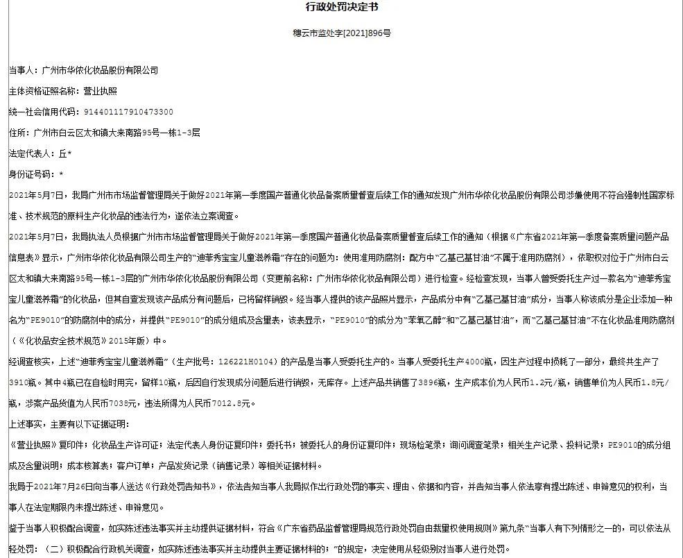 《行政处罚决定书》进一步显示,白云区执法人员在对广州市华侬化妆品有限公司(注:广州华侬变更前名称)进行检查时发现,当事人曾受委托生产过一款名为“迪菲秀宝宝儿童滋养霜”的化妆品,但其自查发现该产品成分有问题后,已将留样销毁。而该产品成分中有“乙基己基甘油”成分,广州华侬称该成分是企业添加一种名为“PE9010”的防腐剂中的成分,并提供“PE9010”的成分组成及含量表。