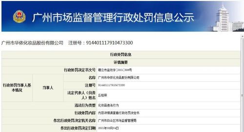 据广州市市场监督管理局官网信息,广州华侬因“化妆品违法行为”,被处以罚款10000元,并没收违法所得7012.8元。