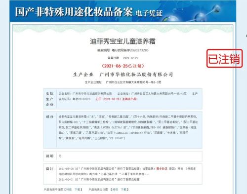 青眼以“迪菲秀宝宝儿童滋养霜”为关键词,在国产非特殊用途化妆品备案平台查询发现,该产品已于今年6月25日被注销。