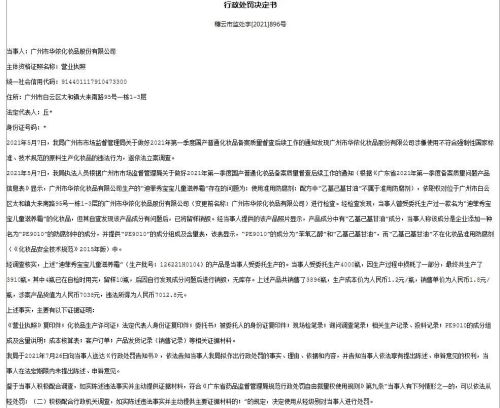 而据广州市白云区市场监督管理局8月4日发布的《行政处罚决定书》显示,今年5月7日,白云区市场执法人员在关于做好2021年第一季度国产普通化妆品备案质量督查后续工作中检查发现,广州华侬涉嫌使用不符合强制性国家标准、技术规范的原料生产化妆品的违法行为,遂依法立案调查。