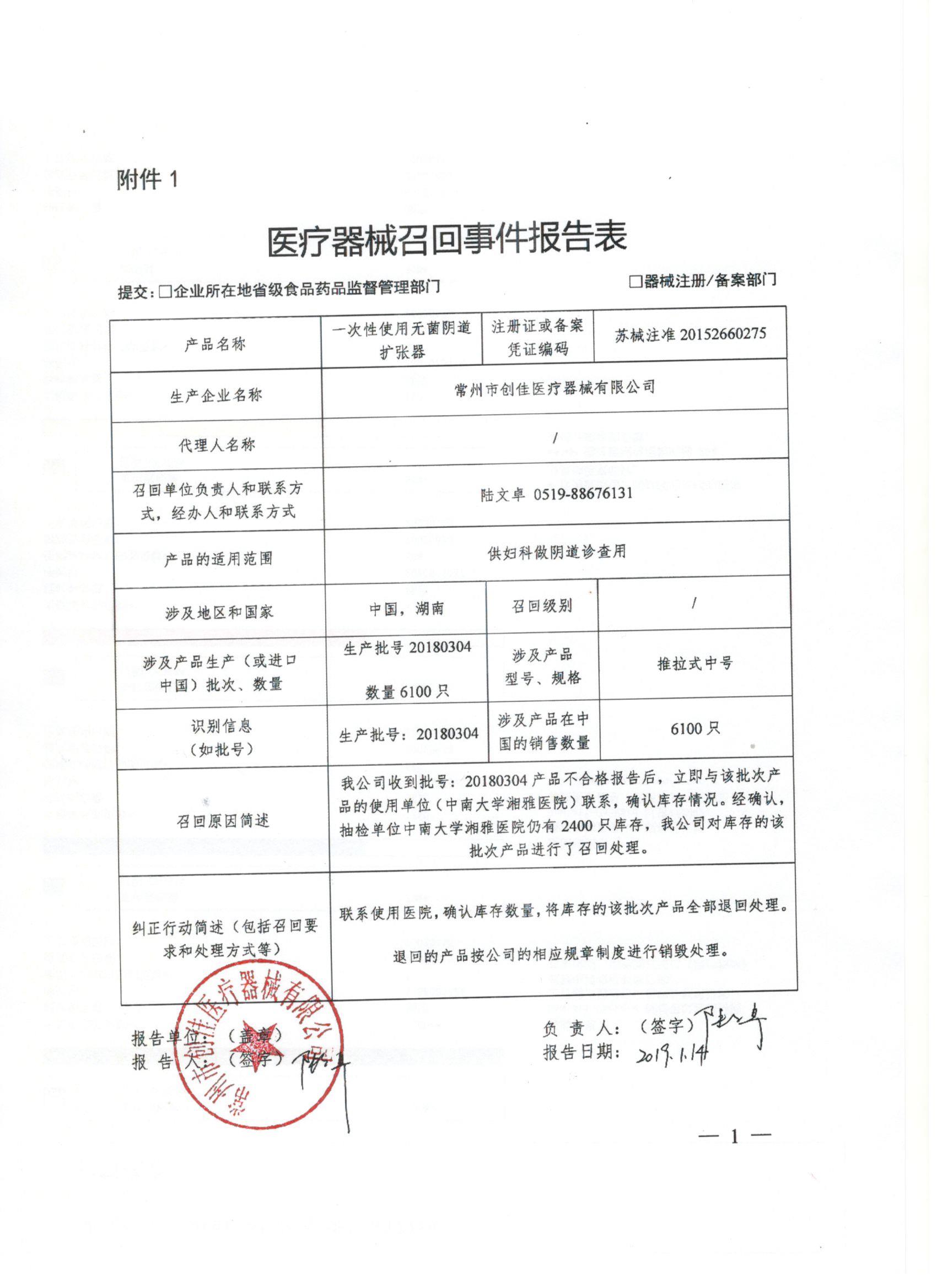 常州市创佳医疗器械有限公司对一次性使用无菌阴道扩张器主动召回