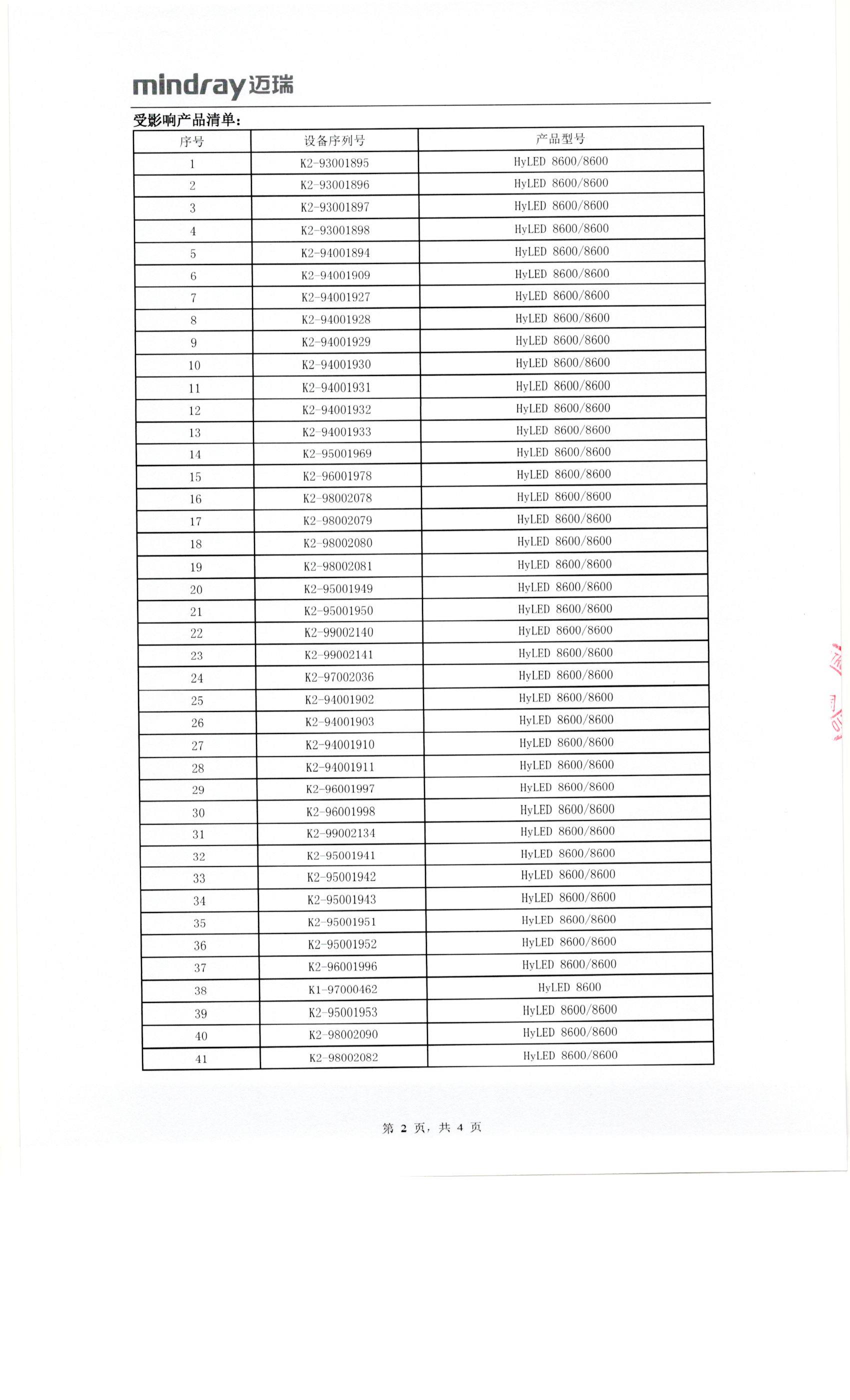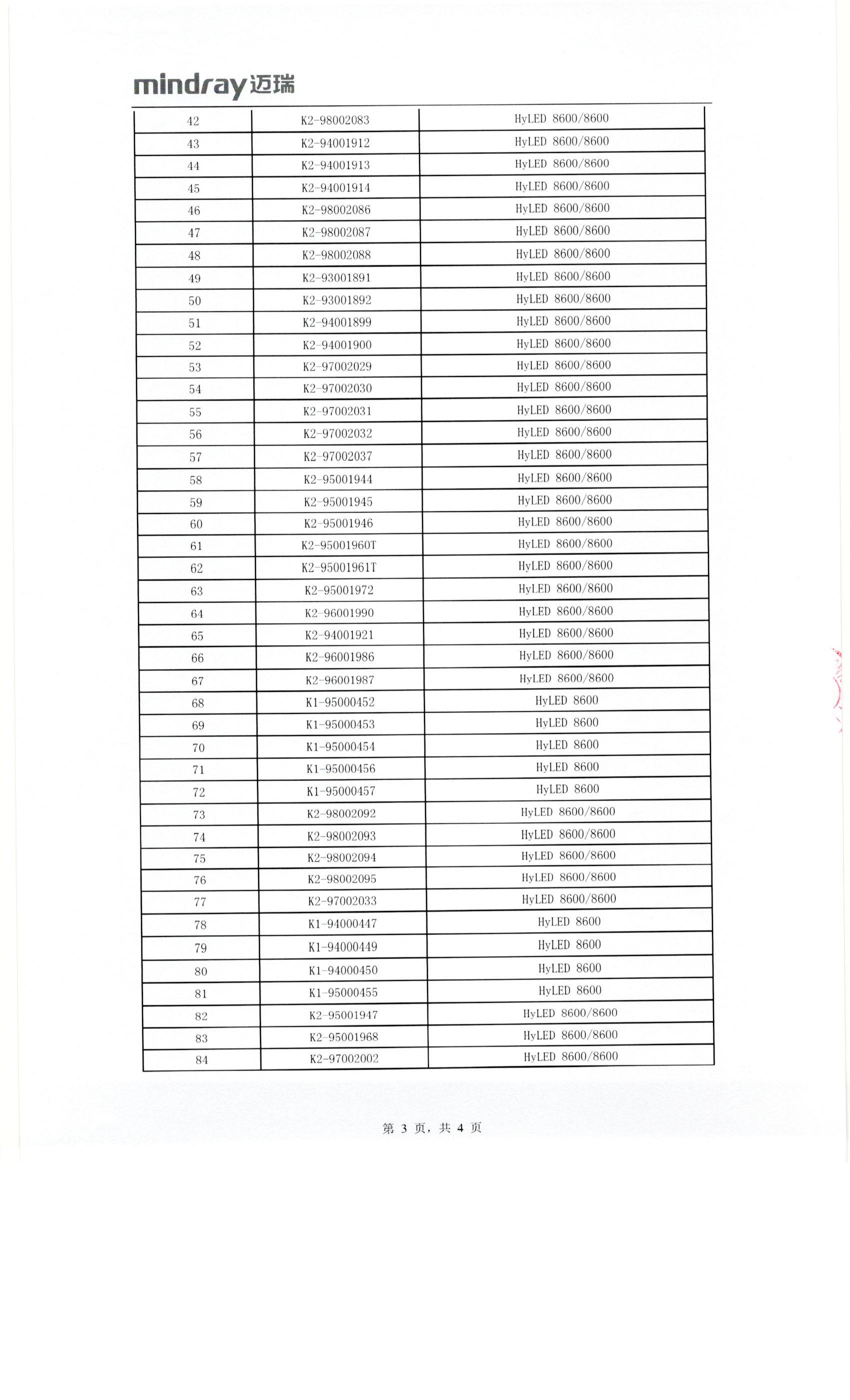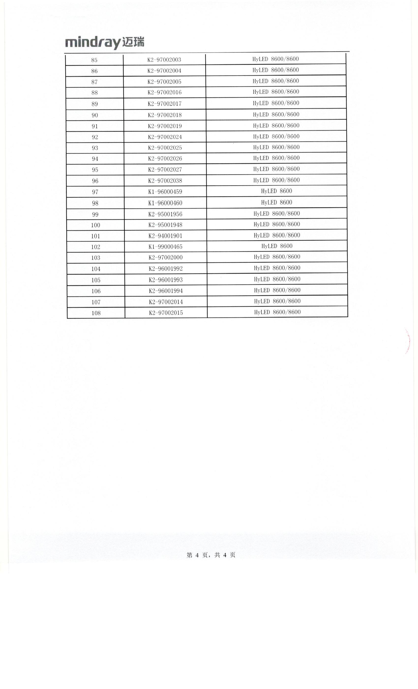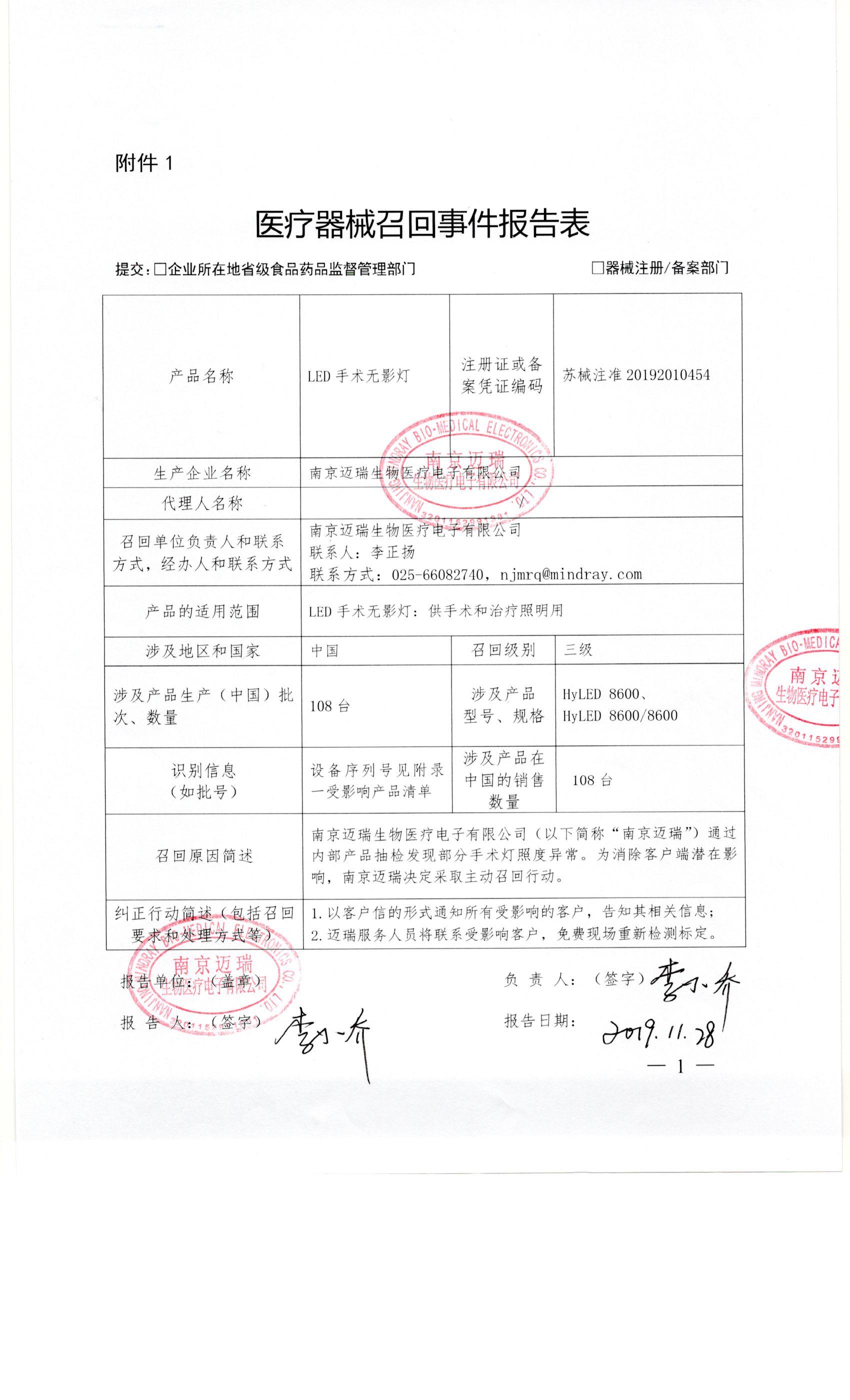 南京迈瑞生物医疗电子有限公司对LED手术无影灯主动召回