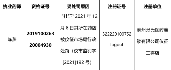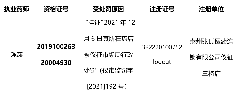 经仪征市市场监管局核查,执业药师陈燕存在“挂证”或其他违法违规行为,扬州市行政审批局已依照规定收缴其注册证并注销注册。省局已按规定将其“挂证”及其他违法违规信息录入全国执业药师注册管理信息系统“奖惩记录”栏,现予公告: