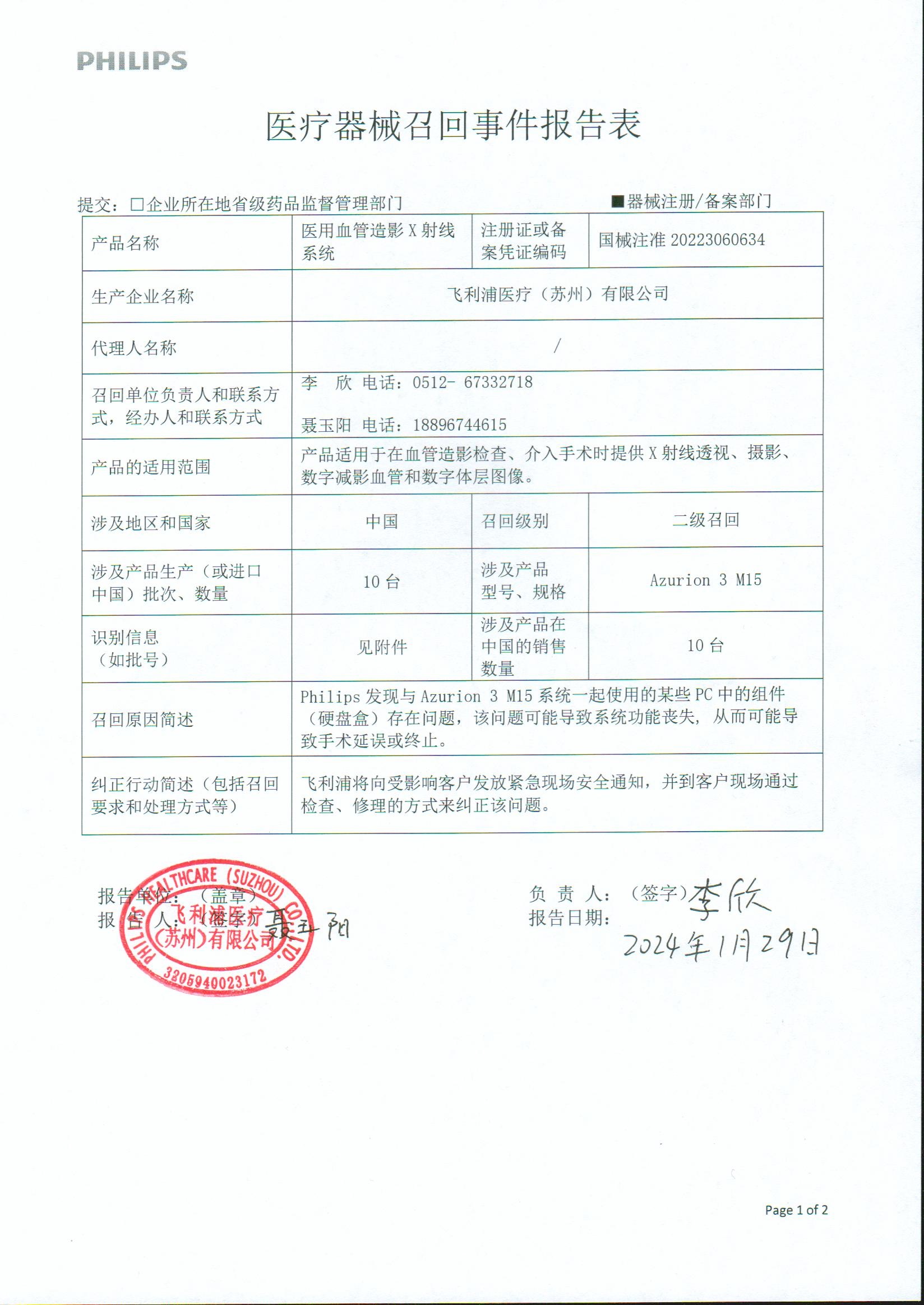 飞利浦医疗(苏州)有限公司对医用血管造影X射线系统主动召回