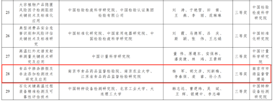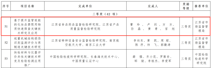 近日,国家市场监管总局发布《关于第二届市场监管科研成果奖授奖的决定》,公布了第二届市场监管科研成果奖获奖项目名单,江苏省食品药品监督检验研究院牵头项目《基于提升监管效能的化妆品禁限用物质快速筛查关键技术研究及应用》荣获三等奖,参与项目《食品中掺杂掺假及非法添加检测技术研究及应用》也荣获三等奖。